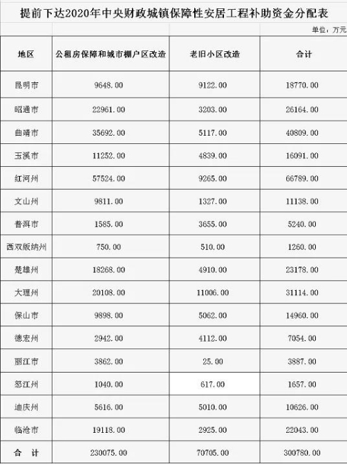 根据《通知二》,提前下达2020年部分中央财政城镇保障性安居工程补助资金分配金额共300780万元,用于云南省16个州(市)的公租房和城市棚户区改造、老旧小区改造。