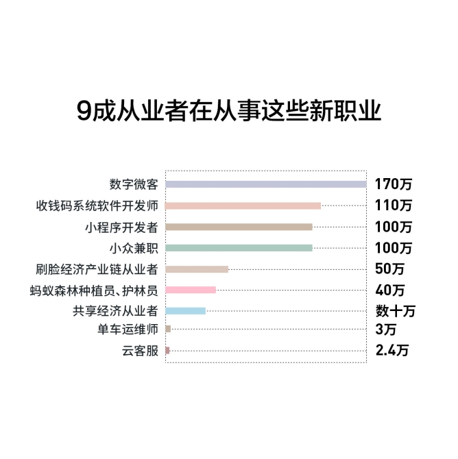 这些新职业,有的因支付宝业务发展而生。如随着支付宝向下沉市场渗透,出现了110万收钱码系统软件开发师,170万向中西部三四线城市小商家推广收钱码的数字微客;随着支付宝出海,出现了海外退税指导师;此外,还有40万人次蚂蚁森林种植员,相互宝调查员等。