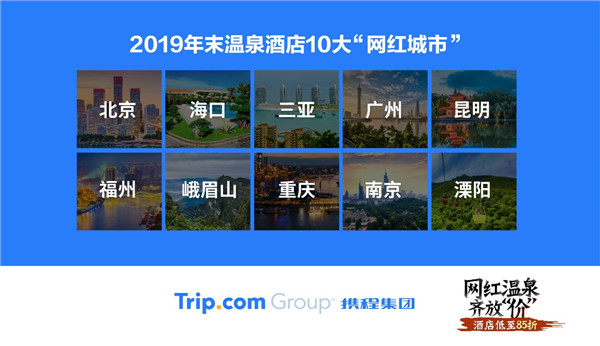 2019年末温泉酒店10大网红城市分别为北京、海口、三亚、广州、昆明、福州、峨眉山、重庆、南京、溧阳。有游客最远飞越4000公里到三亚住温泉酒店,昆明则成为游客晒太阳、泡温泉、喂海鸥的避寒胜地,滇池周边温泉酒店热销。