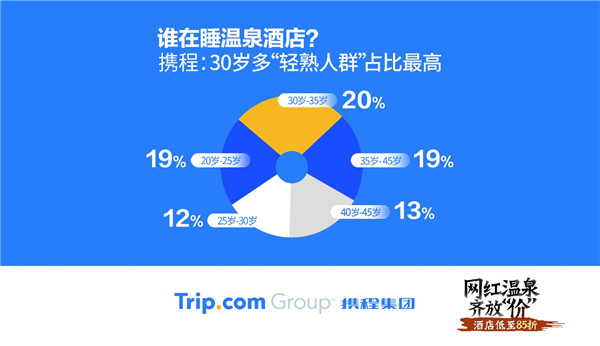 从消费人群来看,30至35岁人群,是今冬温泉酒店最大消费群体,在当季温泉酒店住客的占比达到20%;25至30岁人群,则是上升比例最快的群体,占比达12%;35至40岁人群以及40岁至45岁人群的占比则分别为19%和13%。