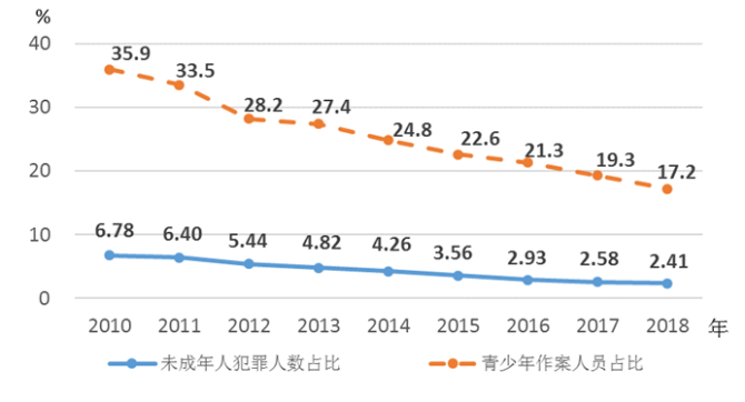 4.未成年人犯罪比重持续降低。我国未成年人犯罪人数占比和青少年作案人员占比继续降低(见图9)。2018年,全国未成年人犯罪人数为3.4万人,与上年基本持平,比2010年减少3.4万人,降幅达49.6%。未成年人犯罪人数占同期犯罪人数的比重为2.41%,比上年下降0.17个百分点,比2010年下降4.37个百分点。青少年作案人员占全部作案人员的比重为17.2%,比上年下降2.1个百分点,比2010年下降18.7个百分点。