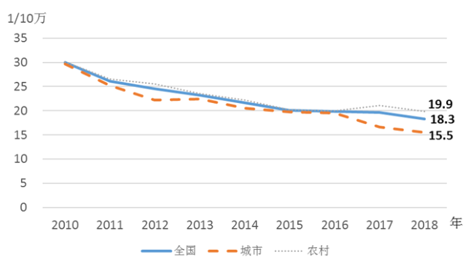 2.孕产妇死亡率持续降低。2018年,孕产妇死亡率18.3/10万,比上年降低6.6%,比2010年降低39%,优于中高收入国家的平均水平。同期城市与农村孕产妇死亡率分别为15.5/10万和19.9/10万,分别比上年降低6.6%和5.7%,比2010年降低47.8%和33.9%(见图1)。