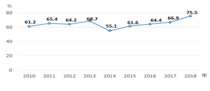 3.妇女生殖保健服务不断加强。国家实施免费计划生育技术服务基本项目,普及避孕节育、优生优育和生殖健康知识,提高生殖健康水平。全国已婚育龄妇女避孕率一直保持在80%以上。截至2018年底,农村妇女宫颈癌、乳腺癌检查已覆盖全国所有贫困县。妇女常见病筛查率经过几年低位徘徊后有了明显上升,由2010年的61.2%上升到2018年的75.5%,提高14.3个百分点,比2017年提高8.6个百分点,但距《纲要》规定的“达到80%以上” 的目标仍有差距(见图2)。