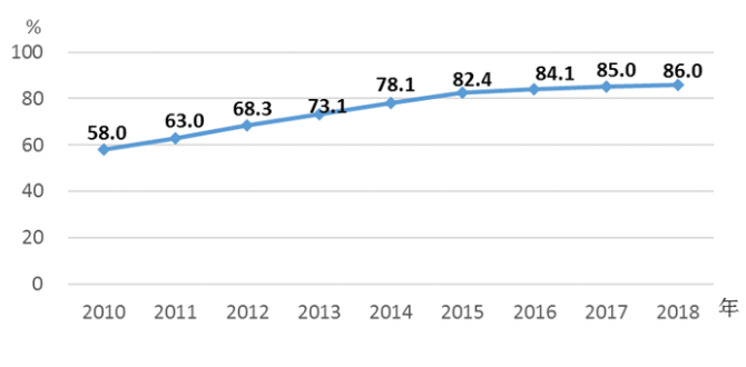 3.农村环境整治力度加大。中共中央、国务院印发的《乡村振兴战略规划(2018—2022年)》,为改善农村环境质量、优化农村人居环境提供了制度保障,美丽乡村建设扎实推进。2018年,农村集中式供水受益人口比重达86%,比2010年提高28个百分点,在上年已“达到85%左右”《纲要》目标的基础上又向前推进了一步(见图8)。