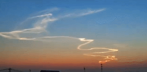 这到底是一朵什么云?中国天气网解释到,这是火箭升空后留下的航迹云,其尾迹被太阳余晖照亮,在延时摄影画面中,呈现出“龙状”。由于高度极高,河北、北京也能看到。