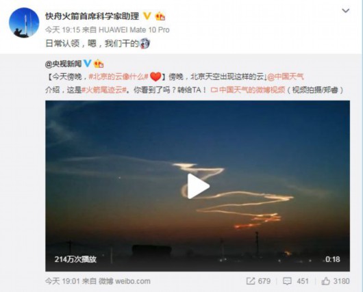 航天科工火箭技术有限公司技术经理出来“认领”了这片航迹云:日常认领,我们干的!