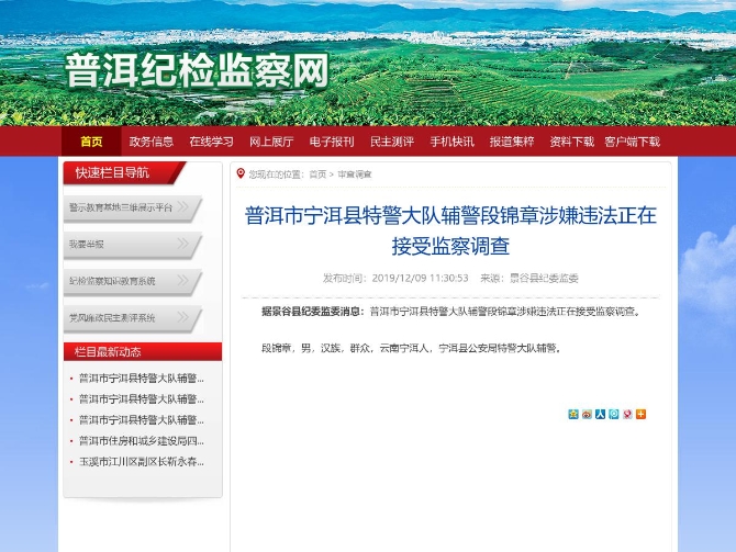 普洱市宁洱县特警大队辅警段锦章涉嫌违法正在接受监察调查