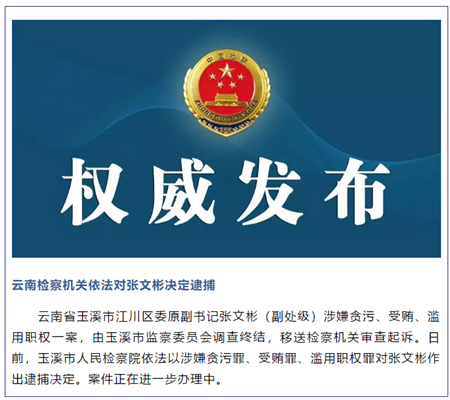 昆明信息港讯 据云南省人民检察院消息,云南省玉溪市江川区委原副书记张文彬(副处级)涉嫌贪污、受贿、滥用职权一案,由玉溪市监察委员会调查终结,移送检察机关审查起诉。日前,玉溪市人民检察院依法以涉嫌贪污罪、受贿罪、滥用职权罪对张文彬作出逮捕决定。案件正在进一步办理中。