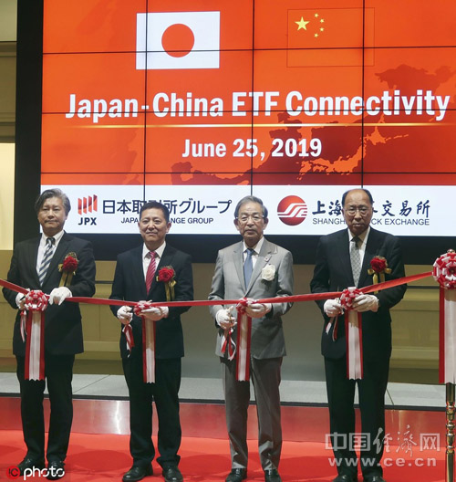 6月25日,上海证券交易所和日本交易所集团分别举行中日ETF互通开通仪式,4只中日ETF互通产品在上海证券交易所成功上市。图为日本交易所集团首席执行官Akira Kiyota(右二)出席东京证券交易所剪彩仪式。(图片来源:东方IC)