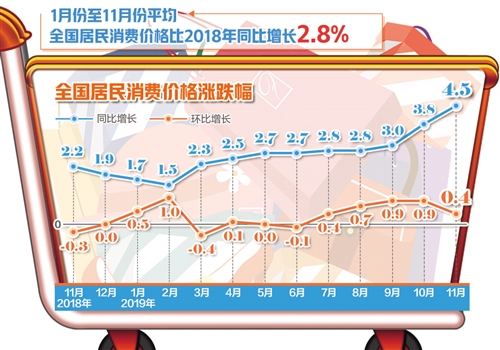 11月份,CPI同比上涨4.5%,涨幅比上月扩大0.7个百分点,处于相对高点。不过,前11个月平均,CPI同比上涨2.8%。