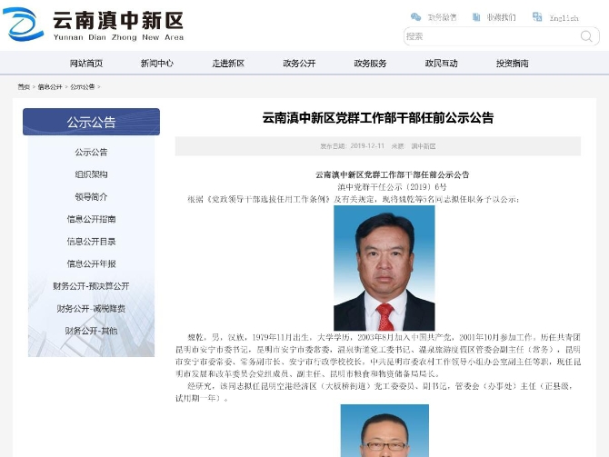公示时间从2019年12月12日起至2019年12月18日止(国家法定节假日除外),如对被公示人有意见或举报,请向云南滇中新区党群工作部反映。通讯地址:云南省昆明空港经济区滇兴街1号滇中商务广场1号楼云南滇中新区党群工作部。邮政编码:650211。联系电话:0871-67336503。