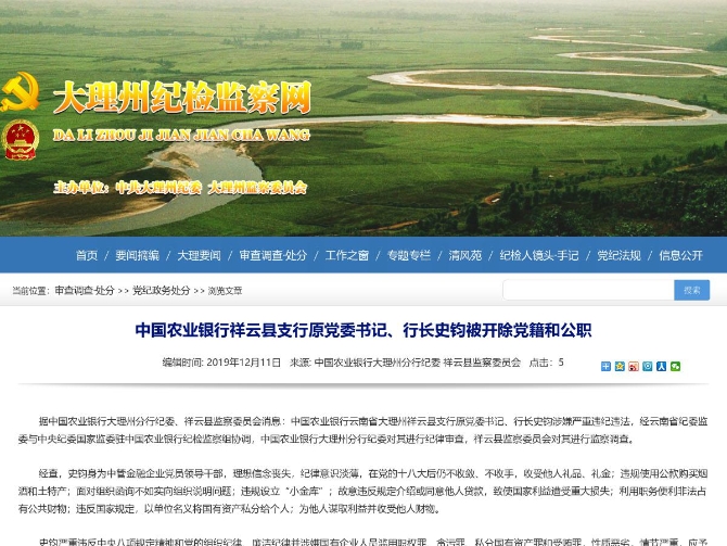 中国农业银行祥云县支行原党委书记、行长史钧被开除党籍和公职