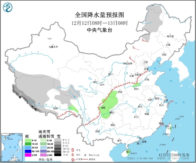 12月12日08时至13日08时,西藏大部、青海南部、内蒙古东部等地有小到中雪或雨夹雪,其中,西藏西南部的部分地区有大雪,局地暴雪(10~15毫米)。四川东部、陕西南部等地的部分地区有小雨。内蒙古东部等地的部分地区有4~5级风(见图1)。