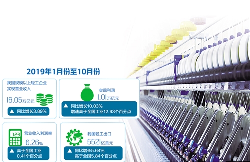 2019年1月份至10月份,我国规模以上轻工企业实现营业收入16.05万亿元,同比增长3.89%,增速低于全国工业0.31个百分点;实现利润1.01万亿元,同比增长10.03%,增速高于全国工业12.93个百分点;营业收入利润率6.26%,高于全国工业0.41个百分点,充分彰显出轻工业发展韧性。