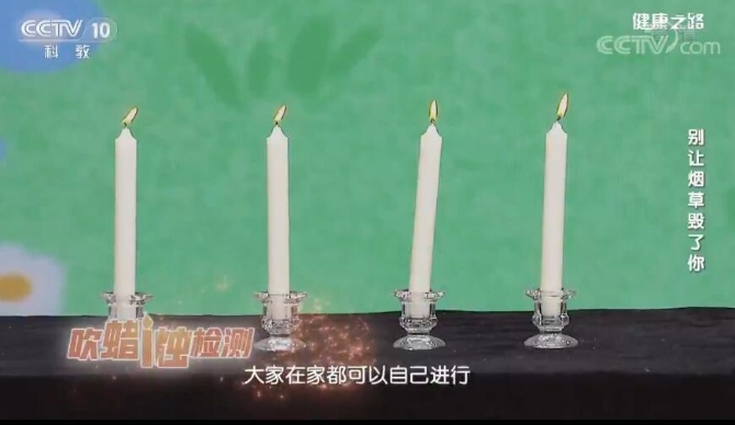 测试方法:在面前摆四根蜡烛,两根蜡烛之间的距离约10公分,最近的一根蜡烛与嘴的距离约为15公分,深吸一口气,用力吹蜡烛,慢阻肺患者可能连最近的一根蜡烛都无法吹灭。