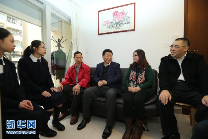 2014年12月19日,国家主席习近平来到石排湾公屋,亲切看望澳门普通市民家庭。这是习近平主席走访市民谭玉娥家。新华社记者兰红光摄