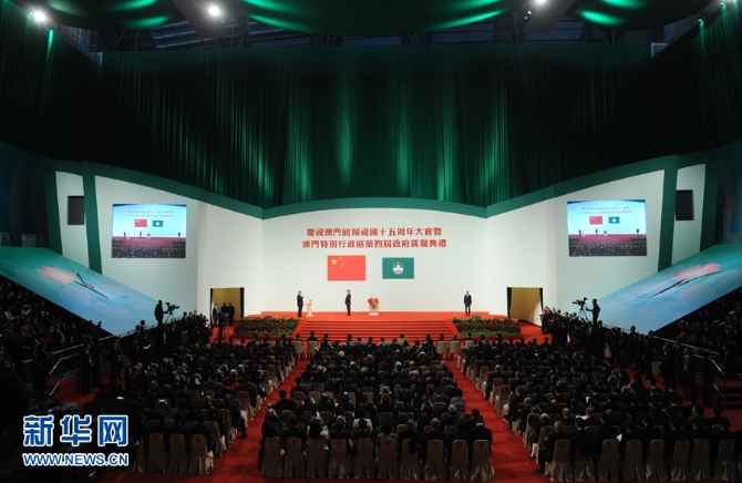 2014年12月20日,中共中央总书记、国家主席、中央军委主席习近平出席澳门回归祖国15周年大会暨澳门特别行政区第四届政府就职典礼。这是由国家主席习近平监誓,澳门特别行政区第四任行政长官崔世安宣誓就职。新华社记者张铎摄