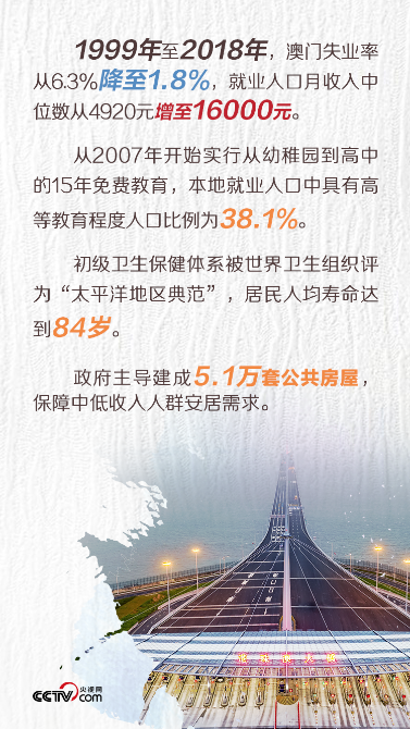回归祖国大家庭后,澳门的民生福利水平“芝麻开花节节高”。截至2018年底,澳门社保基金资产总值增加至近800亿元(澳门元,下同)。居民养老金2019年调升至每月3630元。再加上救济和福利体系日益健全,澳门人民已经越来越多地享受到了国家发展带来的红利。