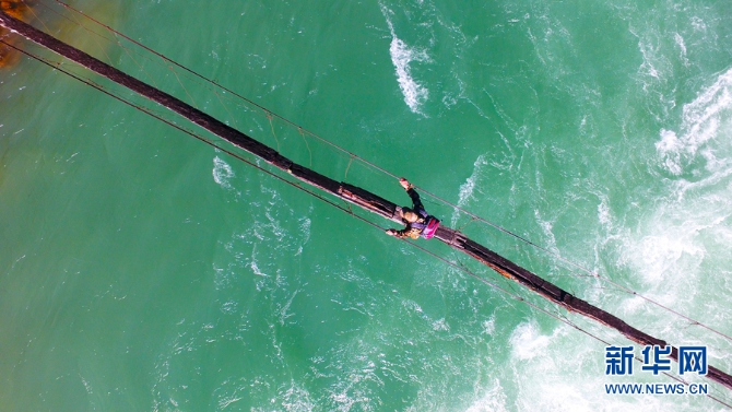 一名护林员正在通过独龙江上的独木桥。新华网 赵普凡/摄