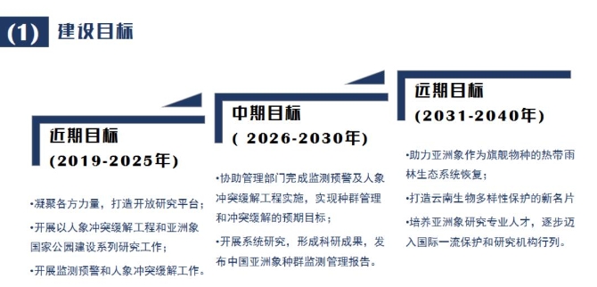 揭牌仪式上,亚洲象研究中心明确了2020年工作计划,并提出了时间跨度为20年的远期建设目标:通过亚洲象保护工程的实施,到2040年,恢复以亚洲象为旗舰物种的云南热带森林生态系统、让亚洲象成为云南生物多样性保护的新名片、培养一批亚洲象研究专业人才,将亚洲象研究中心打造成具有国际一流水平的保护和研究机构。
