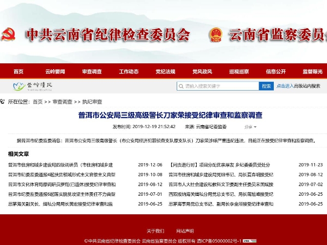 涉嫌严重违纪违法 普洱市公安局三级高级警长刀家荣被查