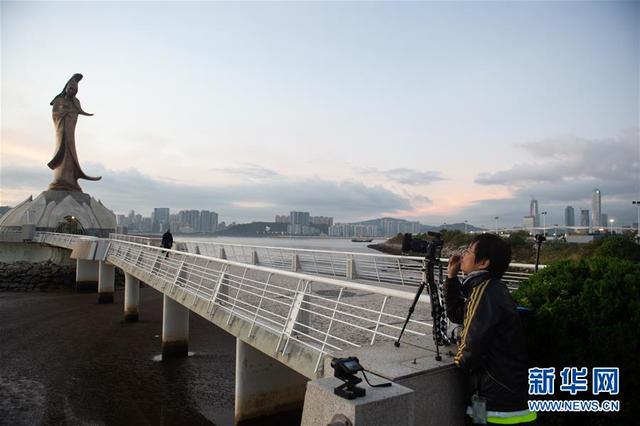 12月17日,一名女子在澳门拍摄日出。 新华社记者 杜宇 摄