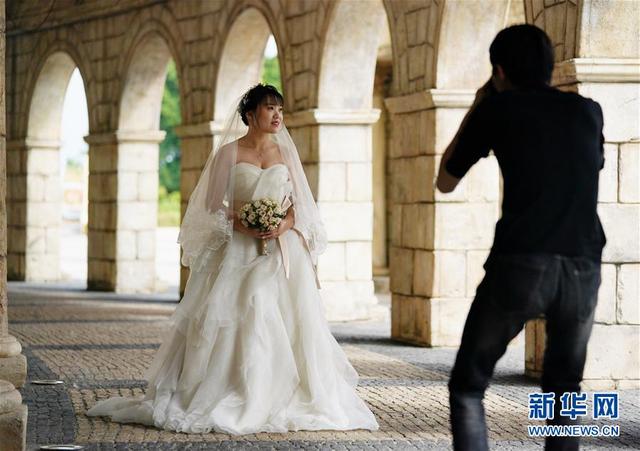 12月17日,女子穿着婚纱在澳门渔人码头拍照。 新华社记者 王申 摄