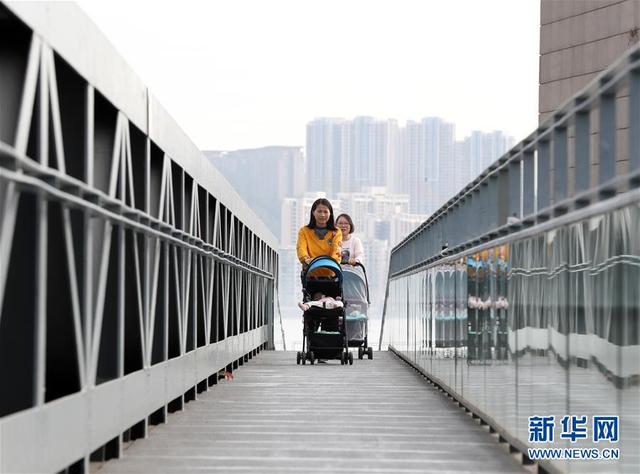 在澳门科学馆附近,两名女士推着婴儿车过桥(12月17日拍摄)。 新华社记者 李钢 摄