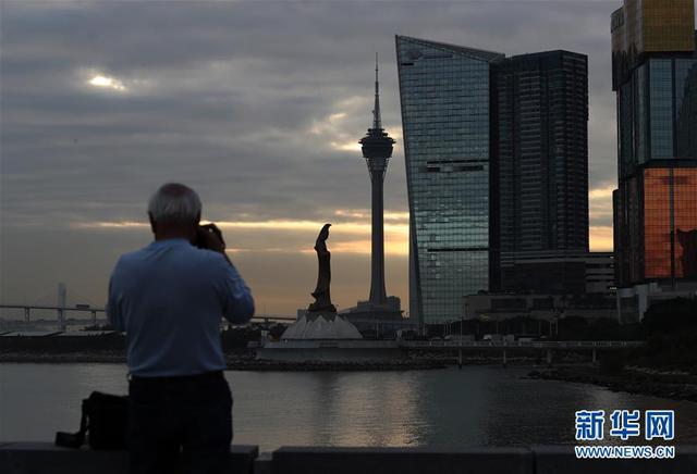 落日时分,一名男子在澳门海边拍摄照片(12月17日拍摄)。新华社记者 李钢 摄