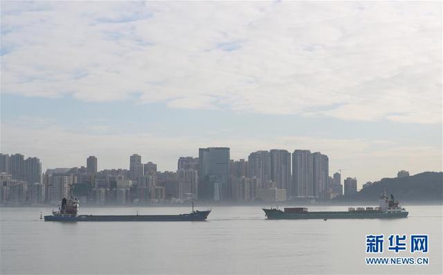 在澳门友谊大桥附近海域,两艘船相向而行(12月17日拍摄)。 新华社记者 李钢 摄