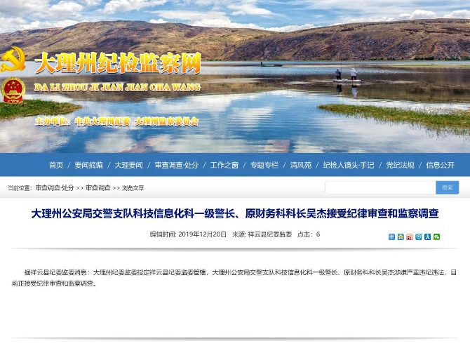 大理州公安局交警支队科技信息化科一级警长、原财务科科长吴杰被查