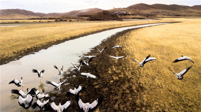 十一月中旬后,黑颈鹤将长途跋涉,穿越四川盆地后到达川、滇、黔三省交界的草海、大山包等地越冬。来年四月,它们才会重返青藏高原。根据当地资料记载,红原县“接待”过的一级保护动物,包括黑颈鹤、黑鹳、中华秋沙鸭等,已经达到了11种,二级保护动物也有29种。