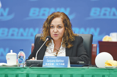 图为2019年4月23日,圣胡安娜·马丁内斯在“一带一路”新闻合作联盟首届理事会议开幕式上发言。 |