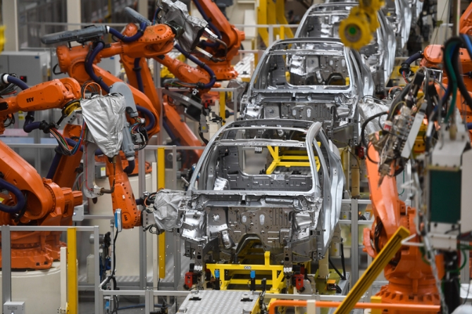 在浙江省宁波市北仑区吉利汽车春晓制造基地拍摄的自动化焊接线(2018年10月25日摄)。新华社记者 黄宗治/摄