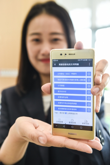 在南京市栖霞区商事登记服务大厅,工作人员展示以微信公众号为平台的“不见面审批”系统(2018年3月29日摄)。新华社记者 李博/摄