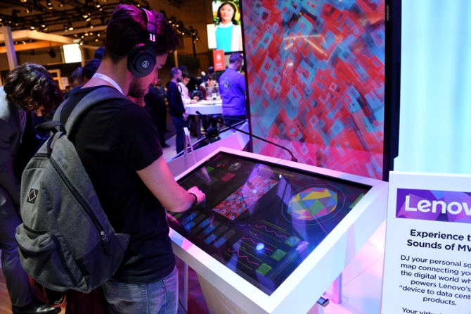 参观者在西班牙巴塞罗那举行的世界移动通信大会上体验联想集团推出的触屏版个人DJ系统(2018年3月1日摄)。新华社记者 郭求达/摄