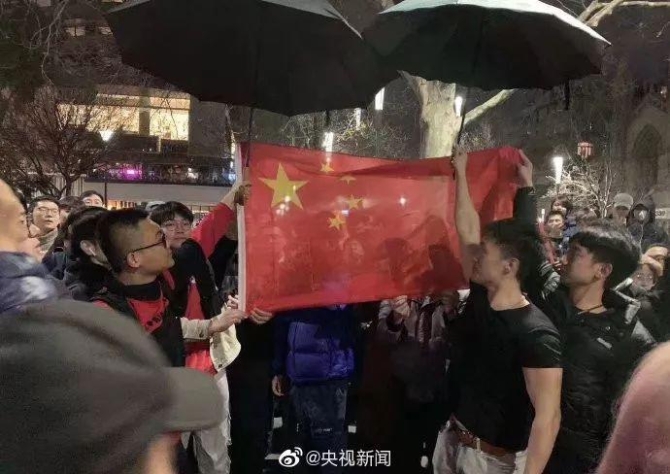 8月16日澳大利亚墨尔本州立图书馆前有乱港分子集会墨尔本中国留学生及华人移民挂起国旗声援祖国当晚下起小雨为避免国旗被淋湿大家雨中为国旗撑伞。