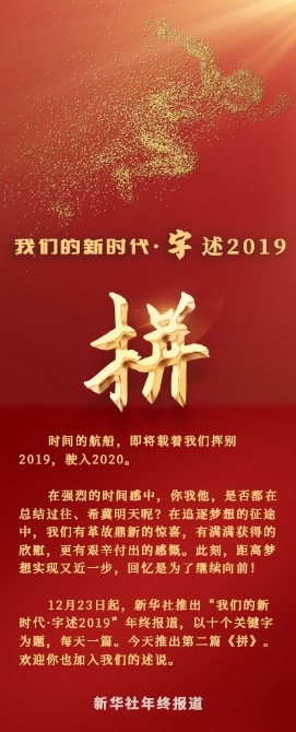 你,我,他,亿万人民敢拼敢干的劲儿,汇聚成中国气派的时代洪流。 “拼”向未来,“拼”向梦想,让我们书写属于祖国、也属于自己的奋斗篇章。