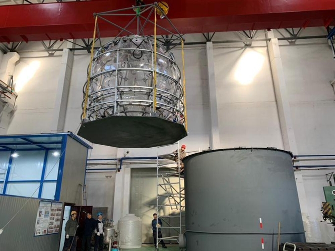 他们将把一个直径达35.4米的有机玻璃球安装在广东省江门市西南部的打石山中。施工人员已经在700多米深的花岗岩下方挖出一个空洞,作为未来的实验大厅。