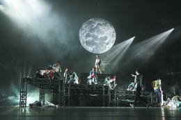舞台被一个硕大的机械装置所占据。你说是转轮也好,说是巨型的盾构机也罢,或说它是别的什么也无关紧要。与旧帝京时代那个动荡、衰败却也和顺安适的老旧茶馆不同,孟京辉和舞美设计师张武所共同呈现的舞台景观,是一个现代/后现代的机械/影像世界。在这里,汉堡包代替烂肉面,手枪代替(上吊用的)裤腰带,RAP代替快板书,机械装置驱动的轰响代替鸽哨和此起彼伏的街声……这个世界同样有许许多多故事:康顺子嫁作太监妻的凄苦的身世,小丁宝对浪漫爱情的渴望,常四爷与松二爷对世道变迁的慨叹……然而在这个巨轮转动的世界里,这一切都只不过是些破碎的故事或故事的碎片。在巨轮转动、纸片纷飞中,不是他们给时代送葬,而是时代将他们埋葬。