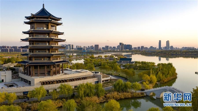 这是11月2日无人机拍摄的银川市阅海公园秋景。新华社记者 冯开华 摄