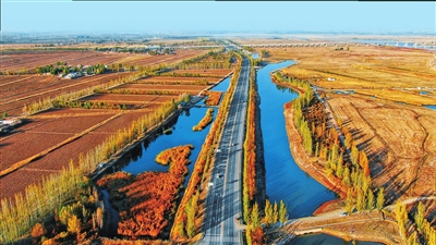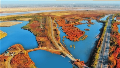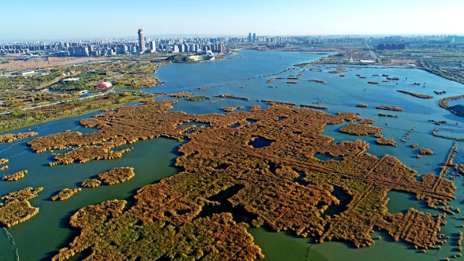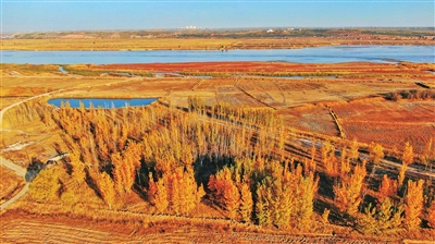 宁夏银川市阅海湿地秋景(10月22日无人机拍摄)。金秋十月,在“塞上湖城”银川市,各城市公园、湖泊湿地秋意盎然、景色怡人。 新华社发