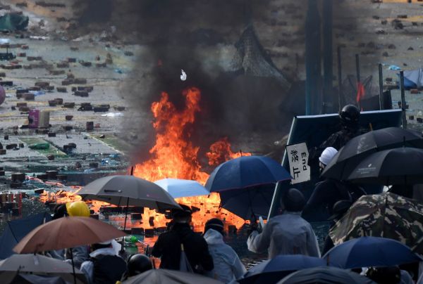 资料图片:今年11月,在香港理工大学外,暴徒纵火、打砸并和警方对峙。(新华社)