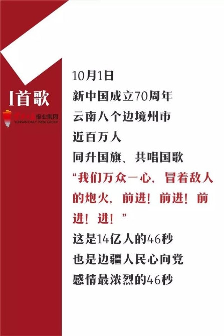 沐浴着新中国70华诞的光辉,10月1日早晨,云南各族干部群众身着盛装,不约而同来到广场、学校、口岸……举行“同升国旗、同唱国歌”活动。