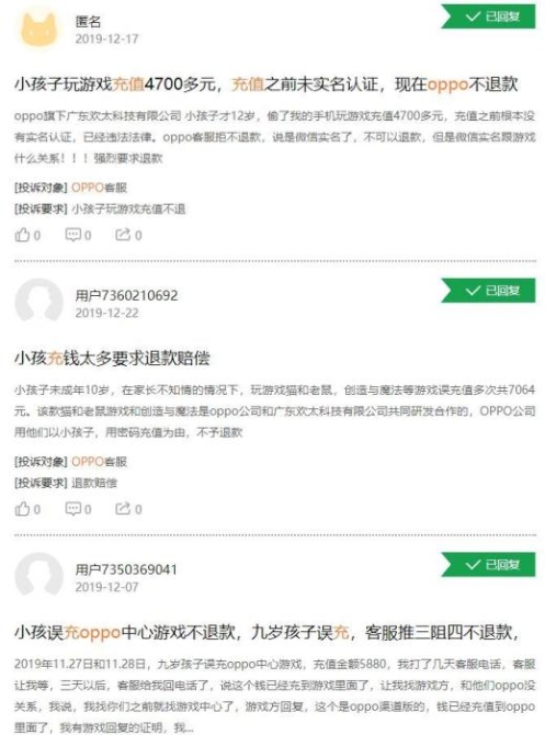 此外,还有来自大连的赵女士近日也向中国网科技诉称,她10岁的儿子在家长不知情的情况下,使用家长的OPPO手机长时间玩游戏,并连续充值购入了8000多元的游戏道具。她将该问题反馈给OPPO客服,得到的答复也是以“投诉人不能举证是未成年人在玩游戏,因而不受理”。