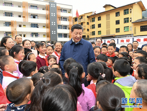 2019年4月15日下午,习近平在石柱土家族自治县中益乡小学同师生亲切交谈,了解义务教育保障情况。 新华社 记者谢环驰/摄