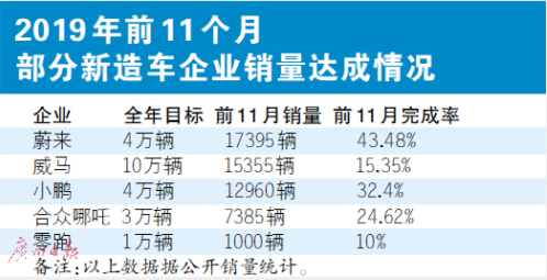 造车新势力在2019年开启了轰轰烈烈的交付之争。随着2019年过去,头部已实现量产交付的品牌,已经发展了5年左右,然而从真正的销量情况来看,体量依然非常“弱小”。蔚来汽车定下的年度目标为4万辆,前11月共售出17395辆。同样定下了年度销量目标为4万辆的小鹏,成绩更差一点,前11个月累计销量不到1.3万辆,预计全年完成率不足四成。威马虽然前11个月销量也有1.5万辆,但与10万辆的宏大目标相比完成率不足两成。不可否认,2019年对于这些新车企来说,是相当波折的一年。几次电动车起火,定价问题差点让蔚来、小鹏陷入困境。还有更多的二线新车企在为融资和量产交付烦恼,2020年对于新车企无疑更难。