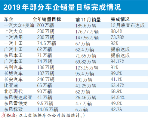 记者统计发现,传统车企方面,截至2019年的11个月份,已经确认提前完成年度目标的就有3家车企,分别是一汽大众、广汽丰田、东风本田。另外还有红旗、奔驰、宝马等数家车企在12月份过后,能顺利完成年初立下的“小目标”,但有更多车企是“就差一步”,约有1/3目标完成率在85%以上,也有1/3的年度目标完成率只有不到六成。