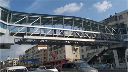 该环形天桥为钢箱梁结构,增设了二层连廊,将天桥与商业建筑联通,与周边商业紧密结合,在提升商业气氛的同时,在景观上形成一个独具特色的空中花园。