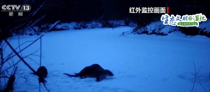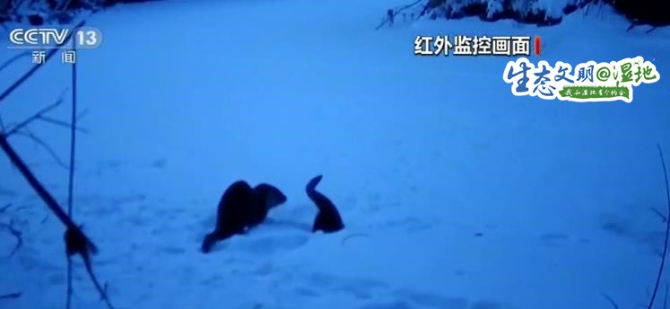 近日,安放在内蒙古大兴安岭卡鲁奔国家湿地公园的红外线相机拍下了两段国家二级保护动物水獭觅食的画面。画面中的这只小家伙非常机警,觅食的同时不时打量周边。另一段视频中三只水獭在集体觅食,它们相继钻进雪洞,可能是雪洞里没有想要的食物,它们很快又钻了出来继续结伴在雪中觅食。